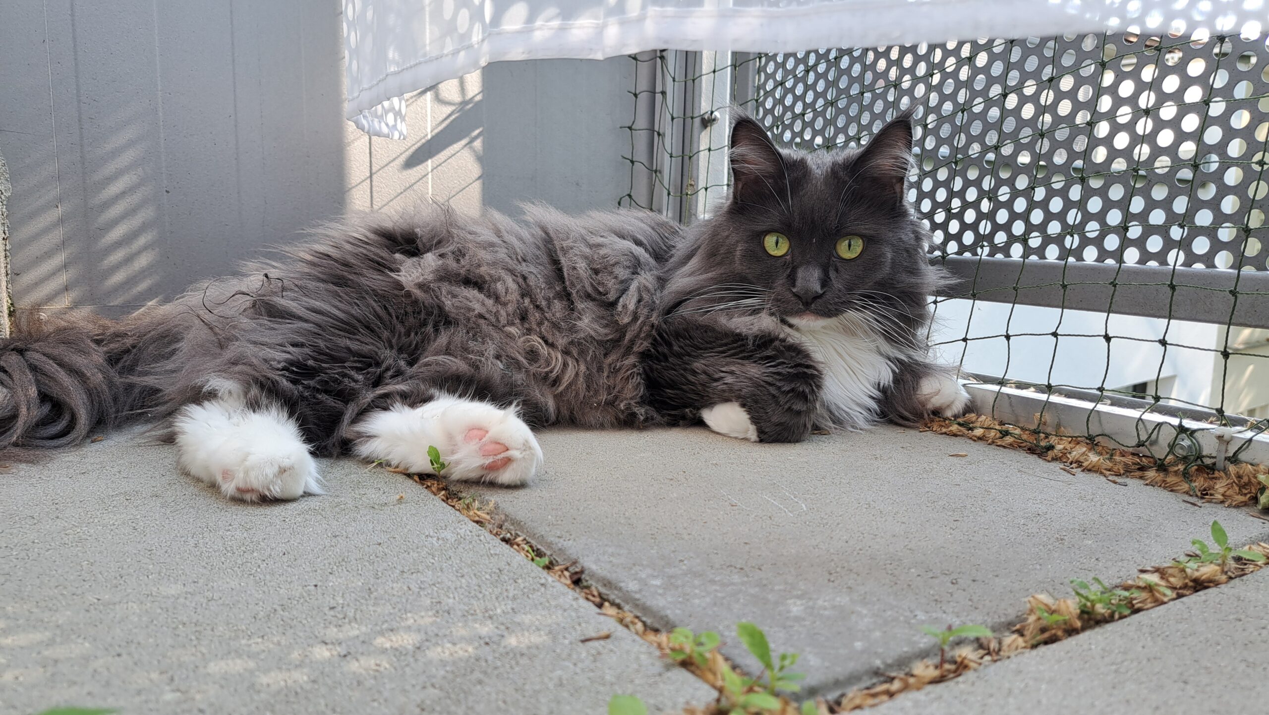 mit einem transparenten Katzengitter für problemfreies Katzenfernsehen bei frischer Luft am Fenster oder mit einem gesicherten Balkon oder Terrasse und einem Leckeri.